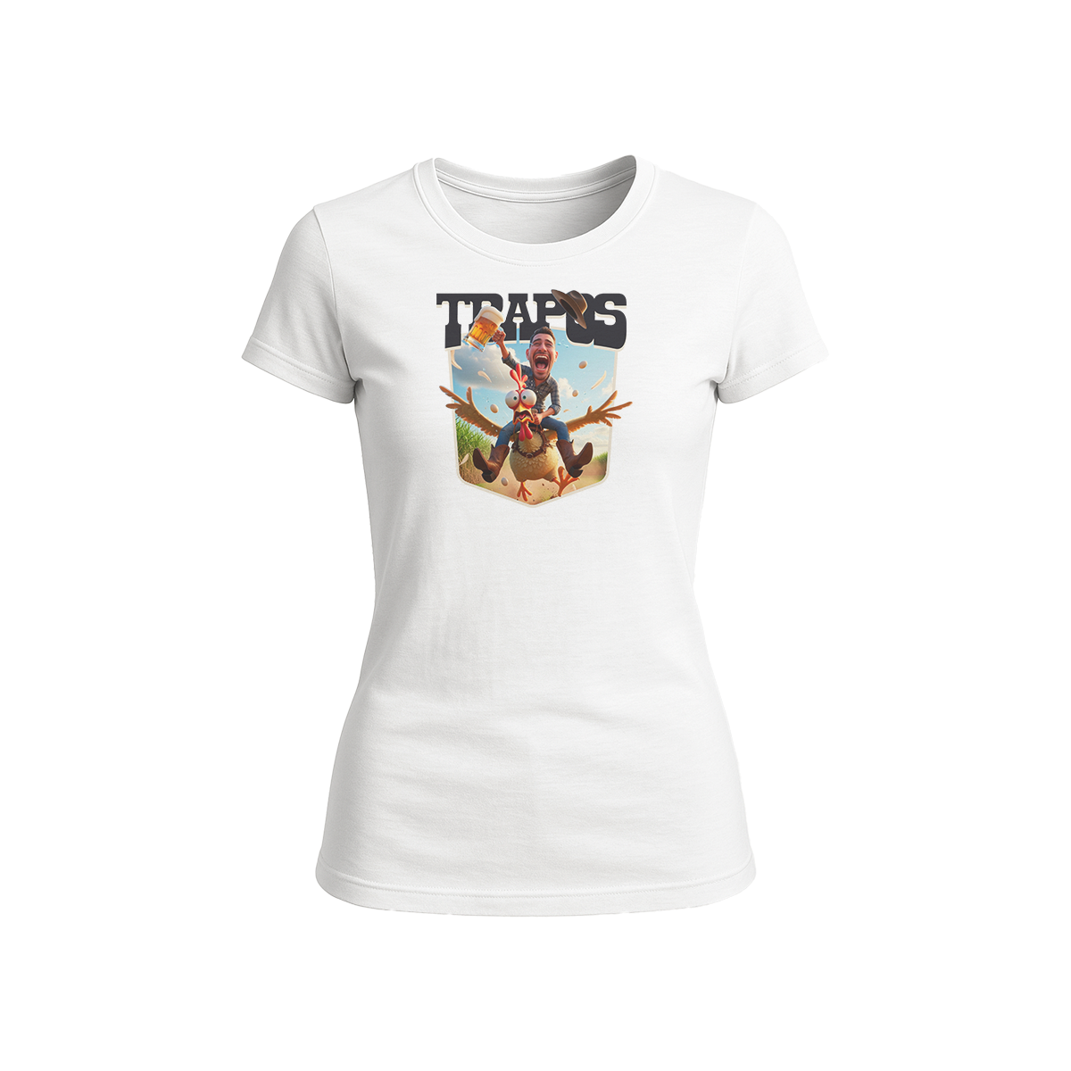 Essa camiseta exclusiva da Trapos Ink traz uma estampa surreal e divertidíssima: um cowboy moderno, caneca de chope na mão, cavalgando uma galinha gigante em plena correria, com ovos e penas voando pelo ar.