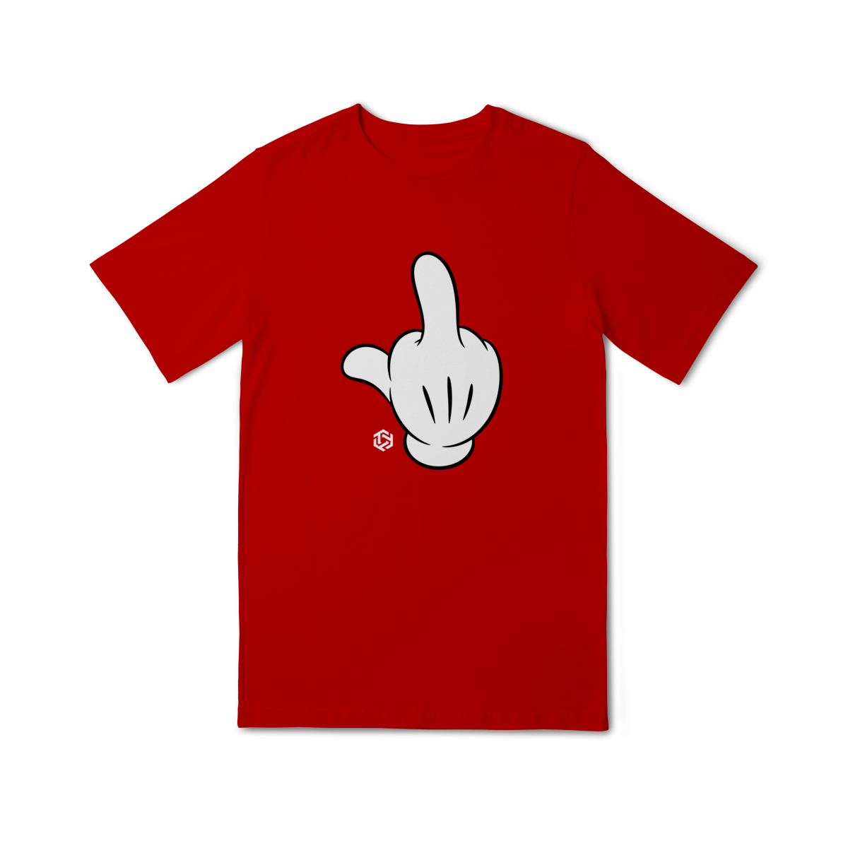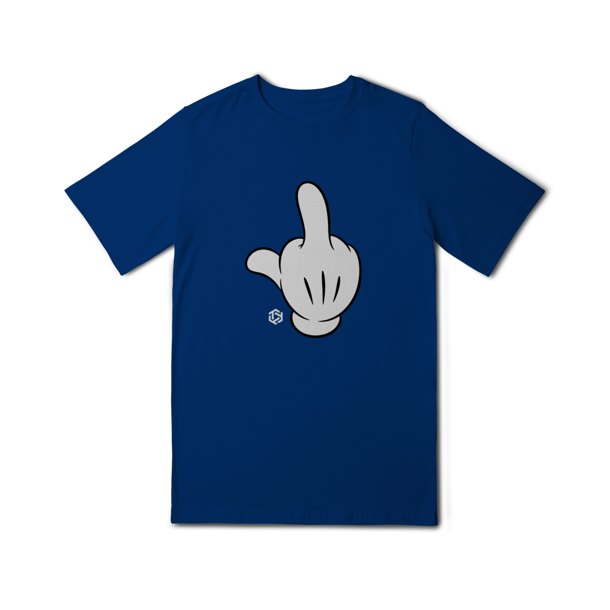 A peça traz como destaque a estampa minimalista de uma luva cartoon em gesto irreverente, que garante personalidade e ousadia ao look.