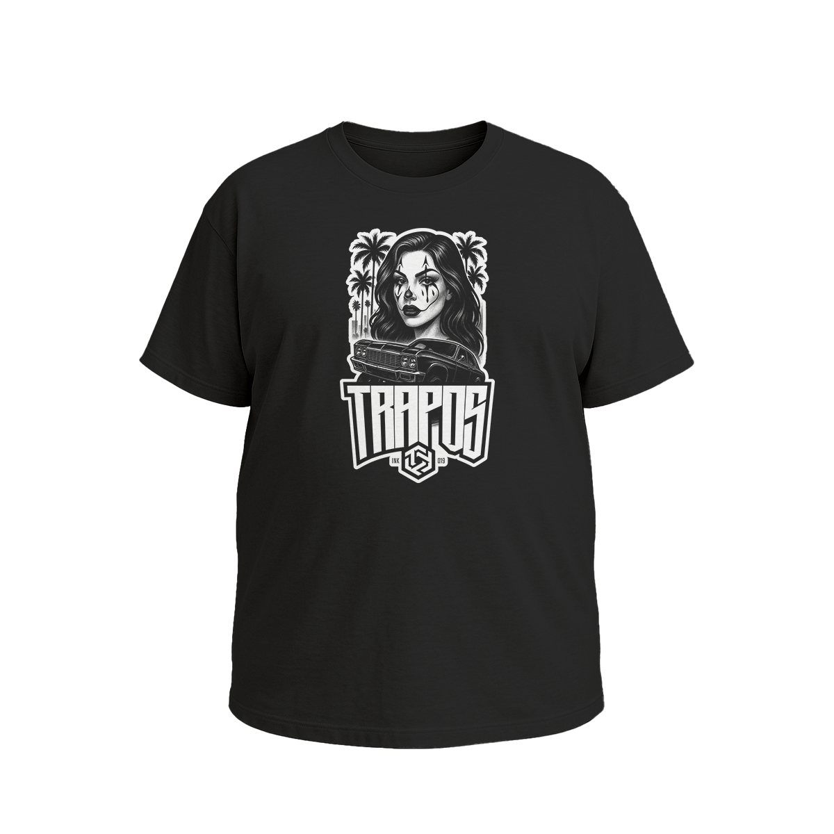 A essência do streetwear chicano ganha vida nessa arte em preto e branco. A estampa traz o contraste da mulher com maquiagem clown face, o clássico carro lowrider e as palmeiras que remetem ao lifestyle de Los Angeles. Um visual marcante, urbano e autêntico, perfeito para quem busca estilo e identidade nas ruas. Camiseta exclusiva da Trapos Ink, feita para quem não passa despercebido.
